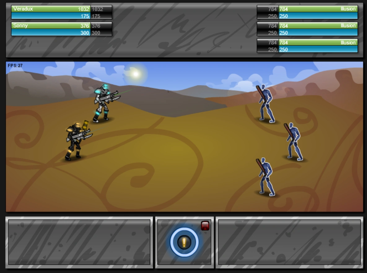 2. The Roaming-Mode screen, in which the player can prepare for their next battle by organizing their inventory, their equipment, their skills (see Attributes and Abilities), saving the game, and visiting shops. This is the main screen, and players can engage in training battles, or primary battles to move further into the zone.