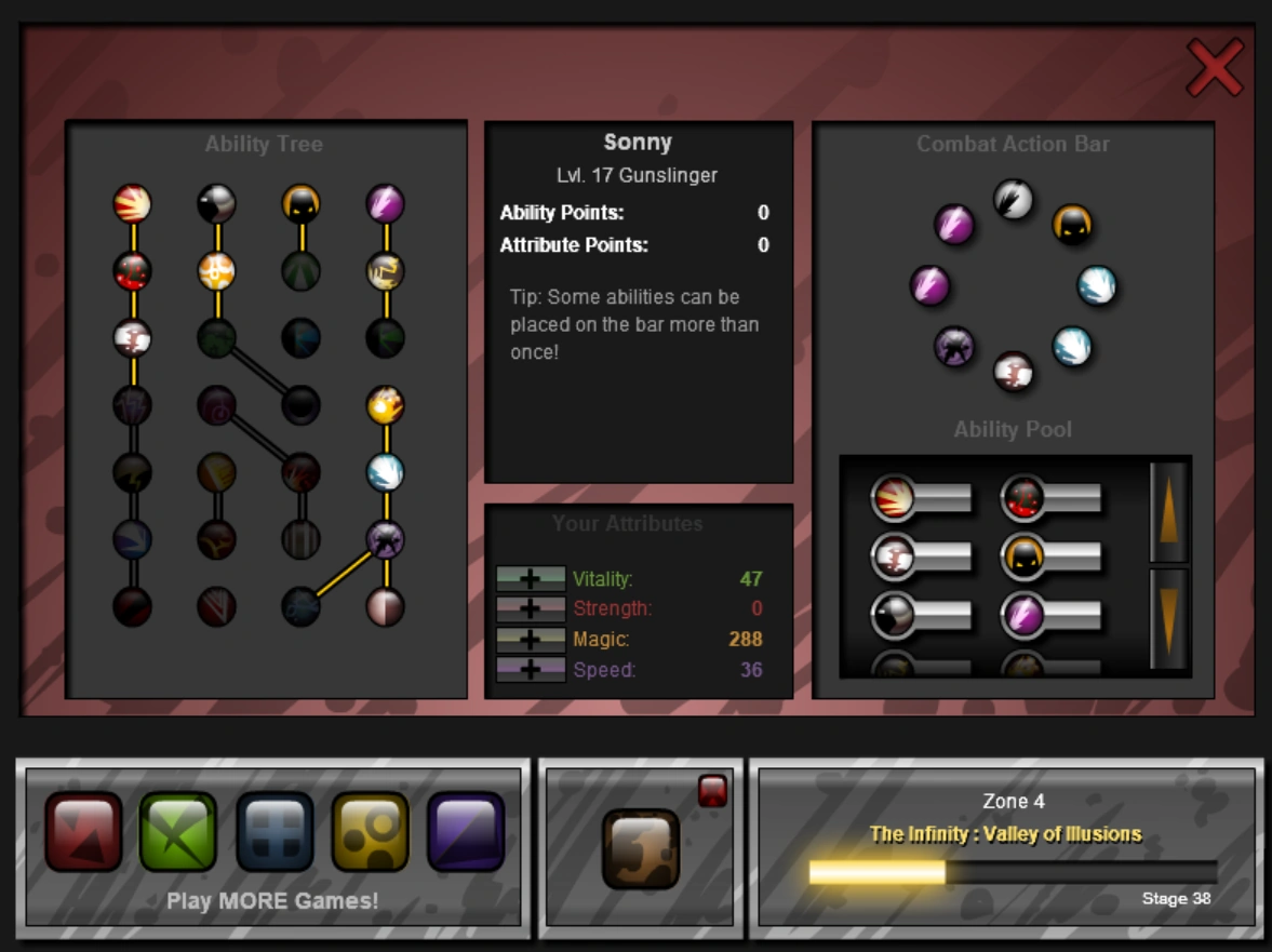 Ability Points are used to unlock or improve Abilities. Abilities are used for powerful attacks, healing, or to temporarily improve/reduce a character's Attributes. Unlike Sonny 2 and Sonny (2017), in Sonny 1 the ability tree is the same for all Classes.